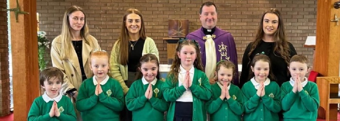 Comhghairdeas leis na páistí i rang a 3 a bhí ag céiliúradh an Chéad Fhaoistín inniu.