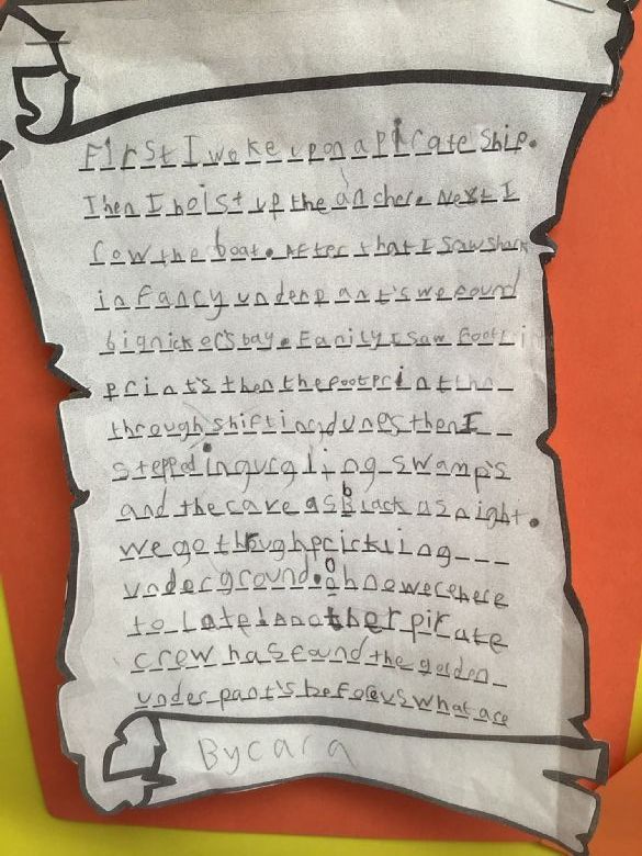 The actions help us to remember the important events and the details that happen in the story. We have used the structure of the story to re-tell the events of the book from the point of view of a pirate on the exciting quest to find the golden underpants. Also see below some examples of our wonderful writing in P3!